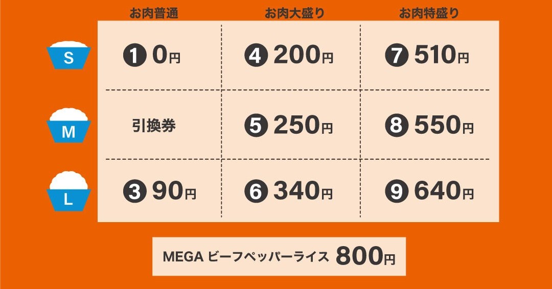 販売時のご案内及び券面上では「お肉普通・ライスM」のみご利用いただけるとご案内しておりますが